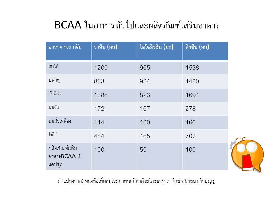 BCAA จะมีประมาณ 15%ของกรดอะมิโนทั้งหมด หากเราได้รับโปรตีนในปริมาณที่สูงแล้ว ร่างกายก็จะได้รับBCAA ในปริมาณที่สูงด้วยเช่นกัน การใช้อาหารเสริมโปรตีนในกลุ่มนักกีฬาที่หวังผลในเรื่องการสร้างโปรตีนและลดการสลายโปรตีนในกล้ามเนื้อนั้น ไม่มีความจำเป็น เพราะในผลิตภัณฑ์เสริมอาหารมีการเติม BCAA น้อยมากเมื่อเทียบกับอาหารปกติ ตามตารางด้านล่าง ดังนั้นกินอาหารจำพวก อกไก่ ถั่วลิสงและไข่ไก่ เพิ่มกว่าปกตินิดเดียว ก็สามารถได้ BCAA ที่เพียงพอกับร่างกายแล้วค่ะ